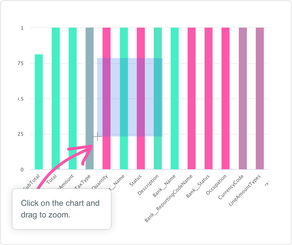 The charts used within ML Data Prep have been designed to be able to show a high altitude view of data at first glance but there may be cases where we have a large amount of content we wish to see the detail of. We have a couple of options to help here: