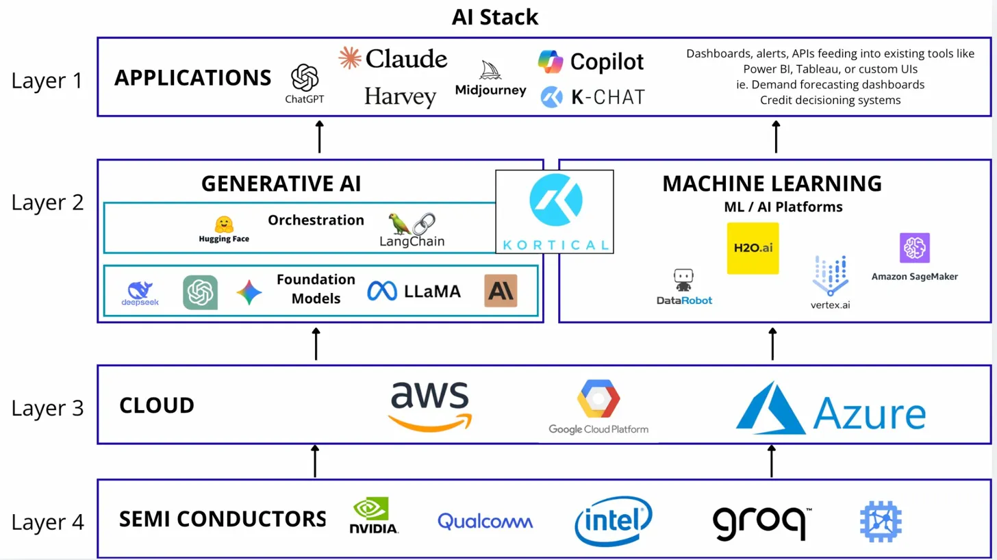 If you're not familiar with the AI stack, here's the short version. It's the set of technology layers that power AI applications: semiconductors, cloud infrastructure, orchestration, foundation models and applications.