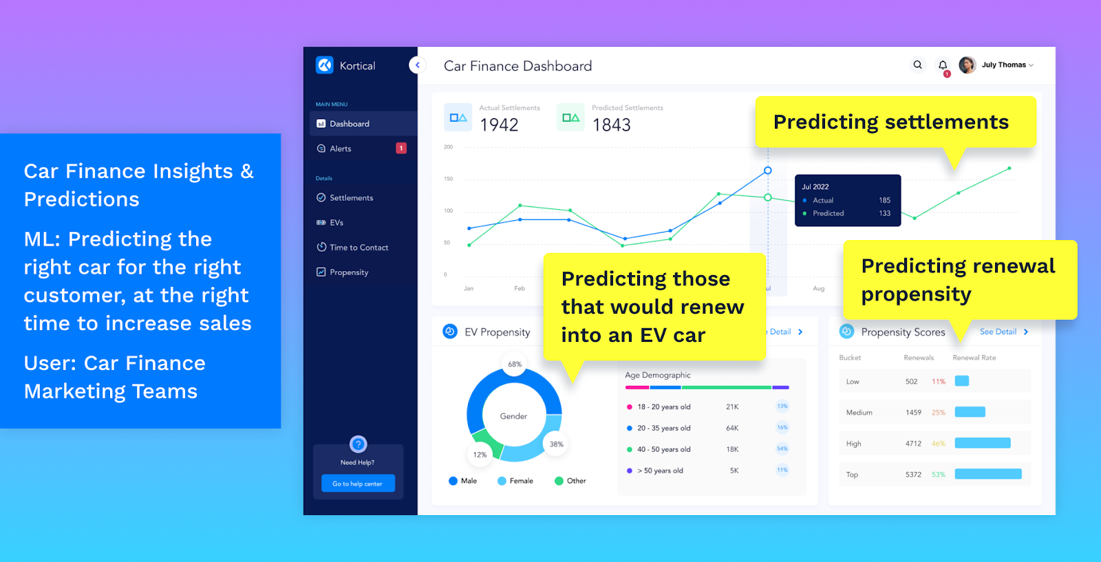 Here's an example from our work with Ford. The predictive maintenance system pulls data from multiple sources (modem data, dealer data, and historic failures), processes it through the Kortical AI Engine, and delivers predictions via API to four different business functions: Warranties, Engineering, Dealers, and Maintenance Teams. Each of those teams has different needs and different systems, and the AI has to plug into all of them.